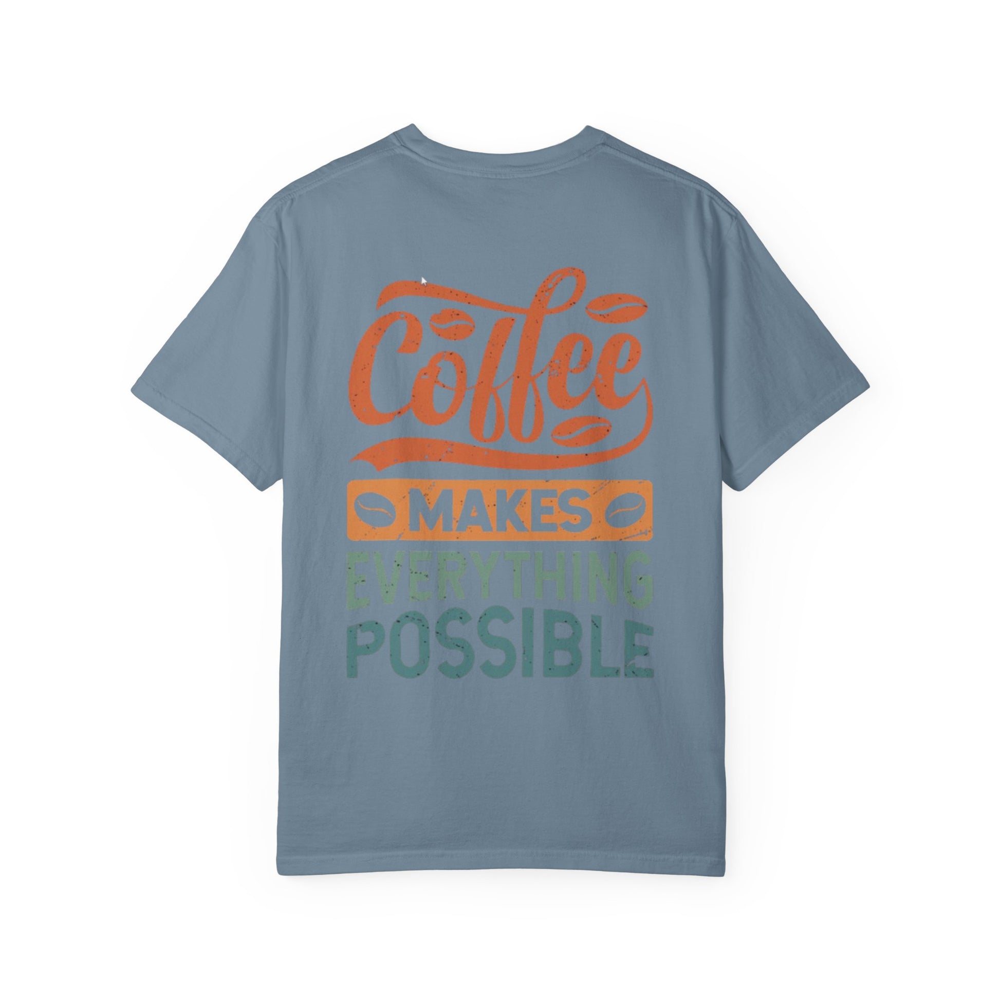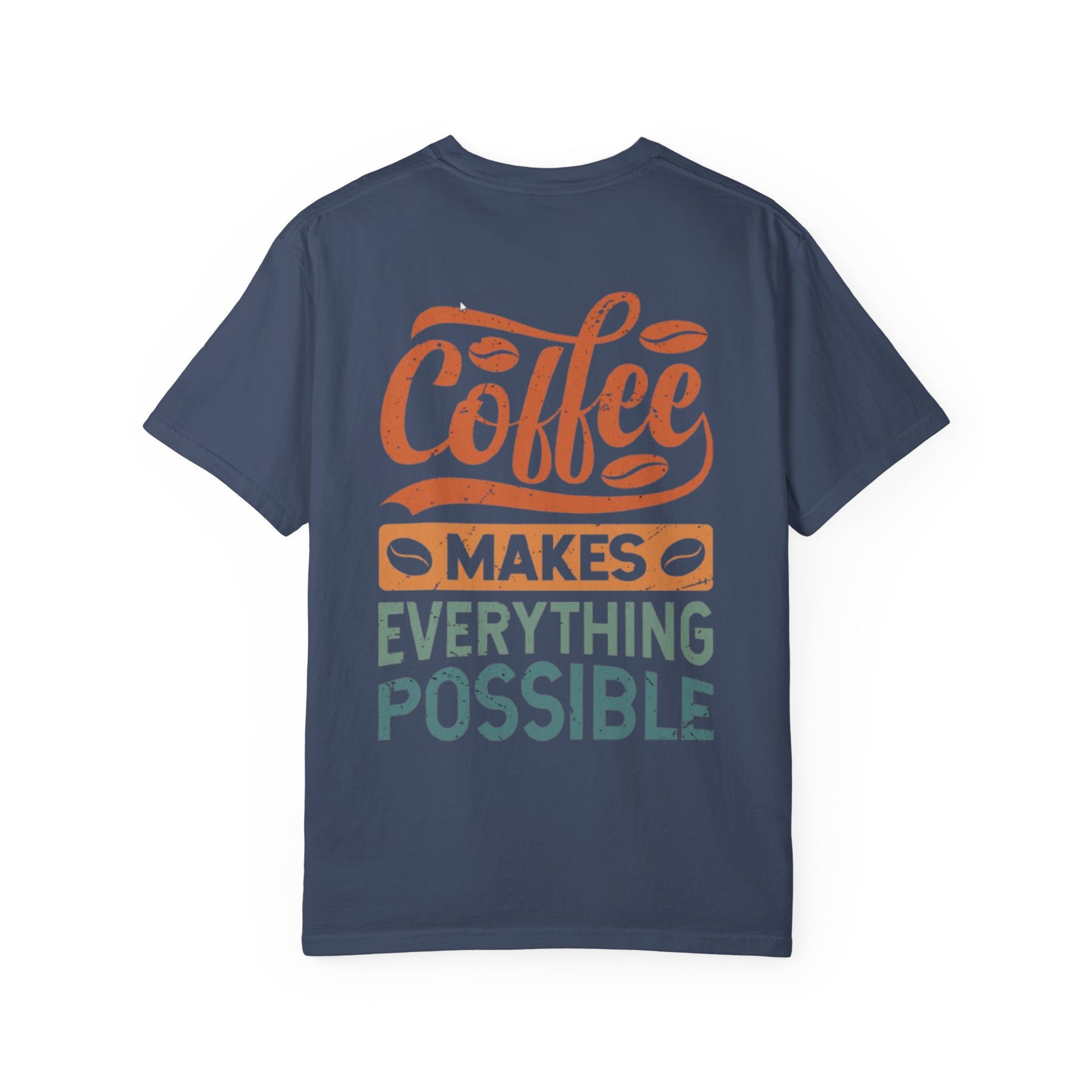 Soft, lived-in comfort with a playful coffee spirit. This heavyweight, garment-dyed tee feels like an old favorite from the first wear—thick ring-spun cotton with a relaxed fit that settles into your routine. A small chest mark and a bold back print read “Coffee makes everything possible,” rendered in warm, muted tones that age beautifully with the dye. Wear it on slow mornings at the kitchen table, during brisk walks to the neighborhood café, or while catching up with friends over a second (or third) cup. It’s the kind of shirt that pairs with worn denim and well-traveled sneakers, and that quietly announces you take your coffee seriously—without taking yourself too seriously.