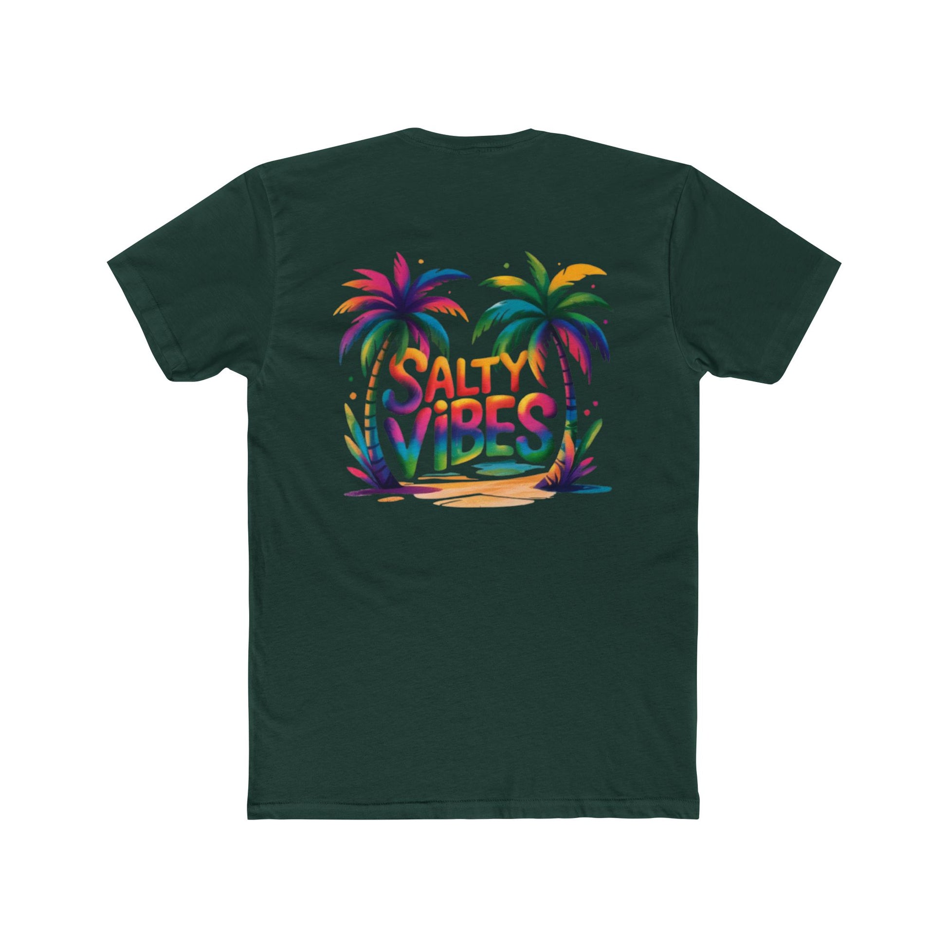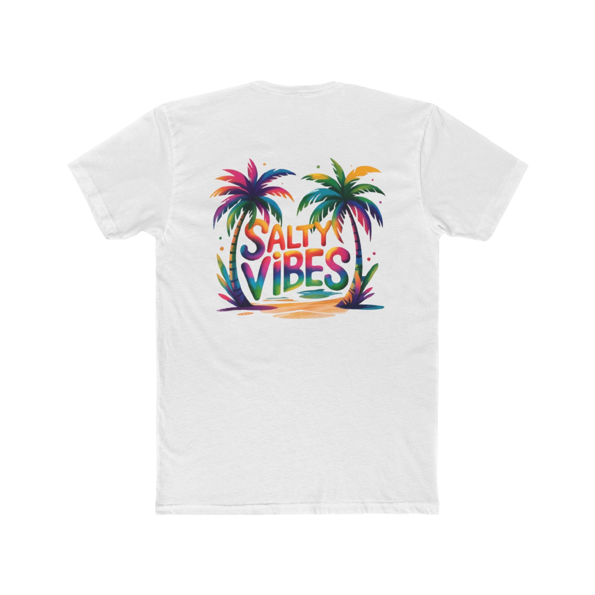 Light, airy, and sun-soaked — this cotton crew tee brings a relaxed coastal mood to everyday wear. A soft 4.3 oz fabric drapes easily while ribbed collar and shoulder tape keep the fit neat through repeated wear. The artwork channels bright, tropical energy: two palm trees arch over a sandy patch with lively, hand-painted lettering that reads “Salty Vibes.” Worn alone or layered under an open shirt, it carries the feeling of an afternoon by the water — salt on your skin, a warm breeze, and colors that refuse to fade. Durable side seams and quality DTF sleeve printing mean the tee holds its shape and graphics stay bold, wash after wash. Made in Honduras and compliant with EU REACH standards, it’s built for adult wardrobes that lean toward laid-back, beach-adjacent style.