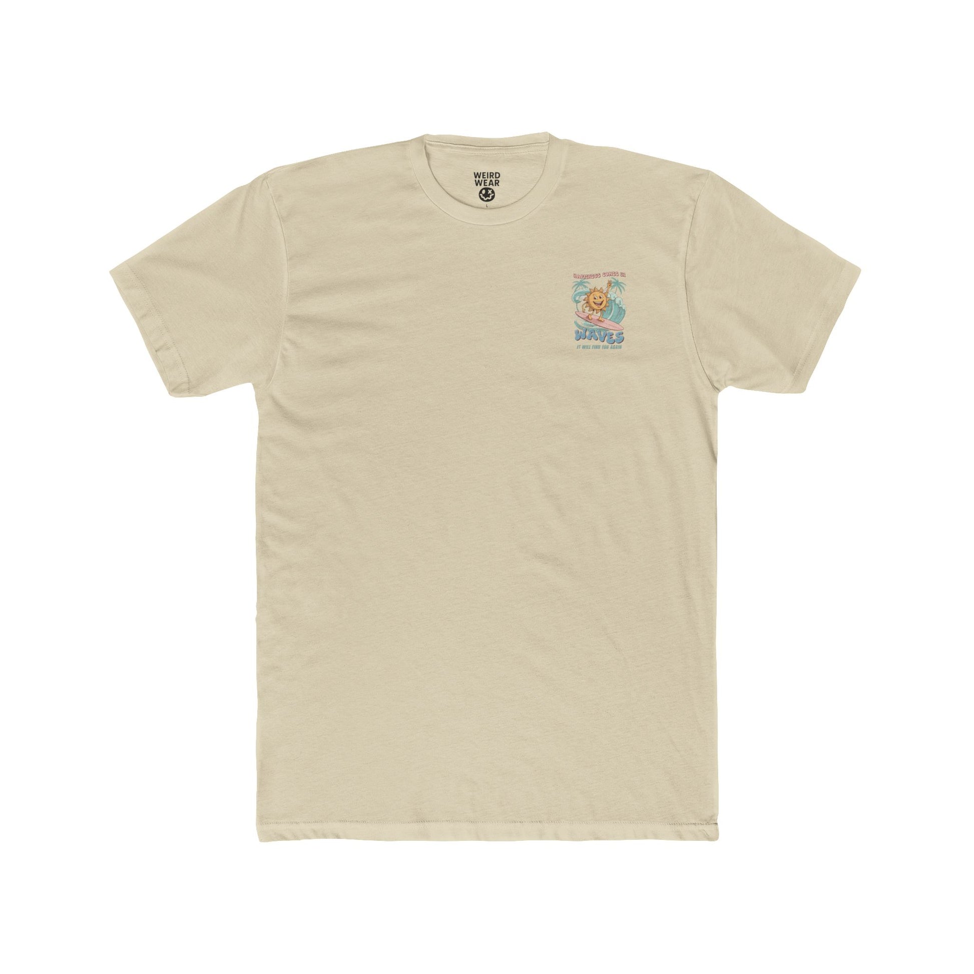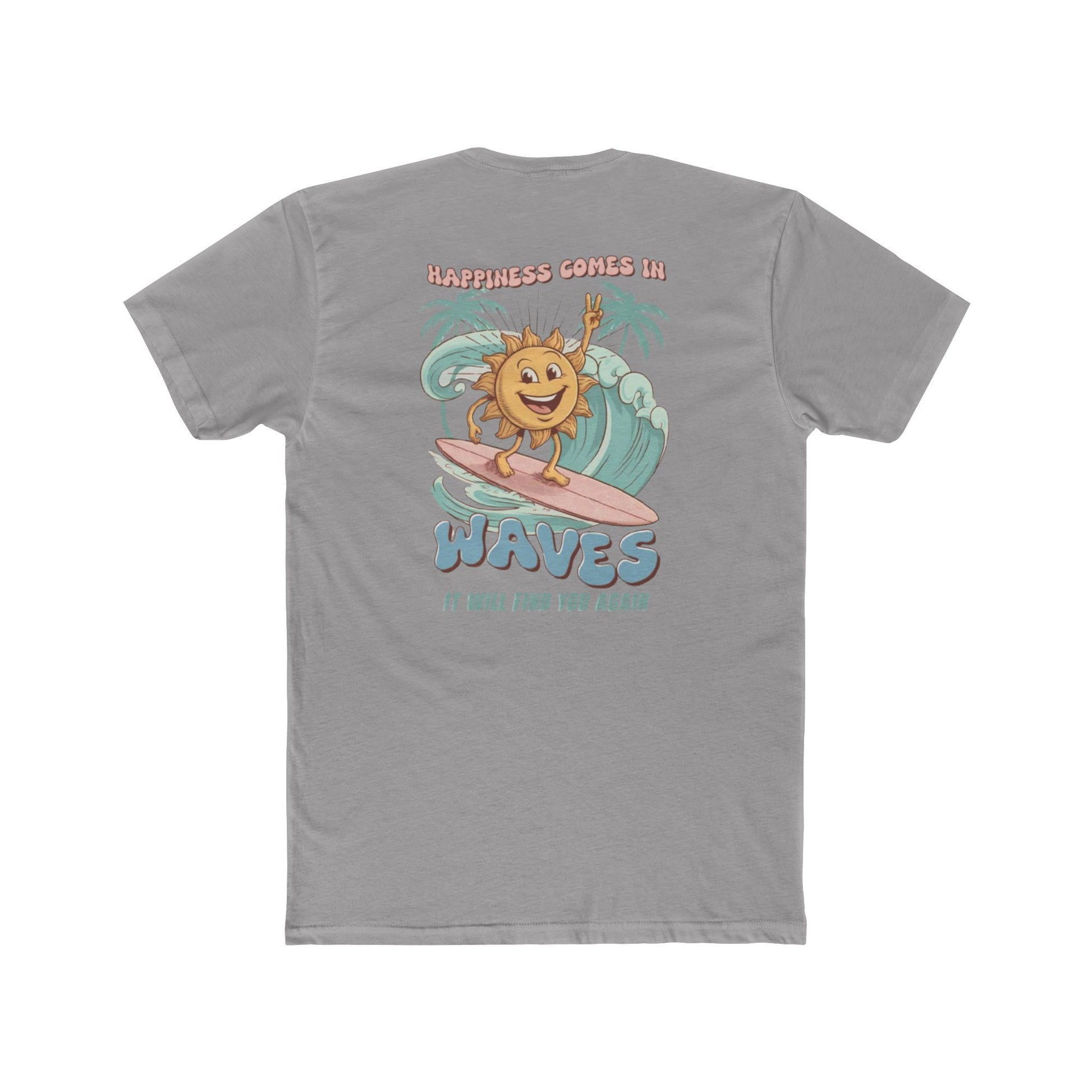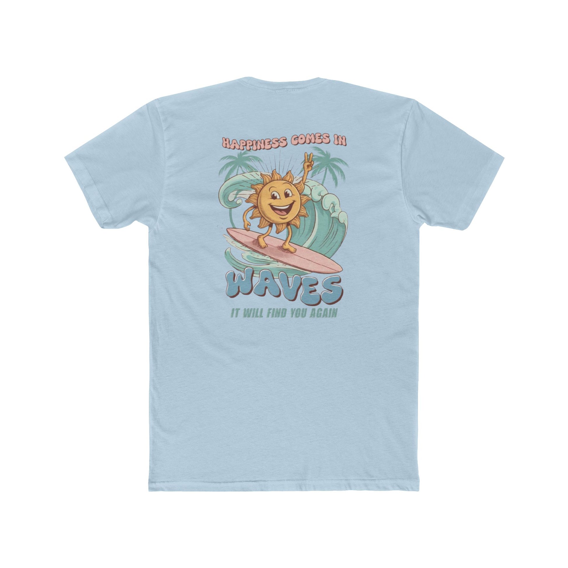 A lightweight cotton crew tee that brings a sun-soaked, surfboard-smooth vibe to everyday wear. Soft, breathable fabric and a classic crew neckline make this shirt an easy grab for warm mornings, beach trips, or late-afternoon hangouts. The front features a small chest motif while the back shows a playful, retro-inspired sun riding a wave with palm trees — an optimistic reminder that good things come back around. Comfortable, understated, and built to keep its shape, this tee layers well under shirts or stands out on its own when the mood calls for salt air and slow smiles.