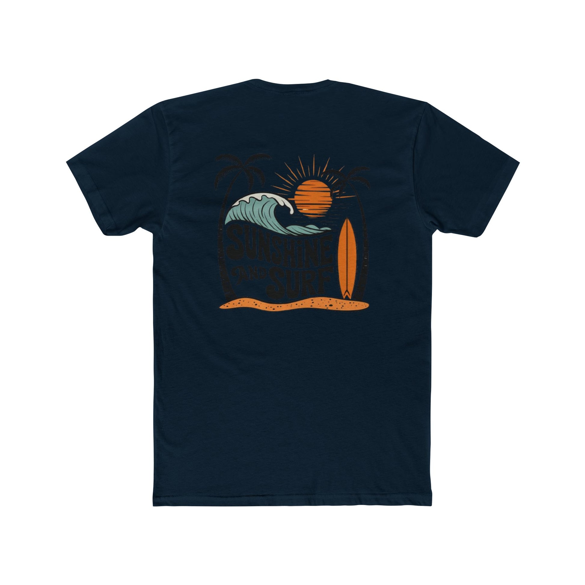 Light, breezy, and made to live in — this cotton crew brings a weekend-on-the-coast mood to your everyday. A small chest illustration hints at salt air and shoreline, while the larger back print bursts with retro surf art: crashing wave, setting sun, palms and a surfboard framing the words “Sunshine and Surf.” The fit sits classic and relaxed, with a soft, lightweight hand that layers easily under a hoodie or stands alone when the day calls for sun. Thoughtful details — ribbed collar, shoulder tape, and side seams — keep its shape through repeated wear and washings. Finished with durable DTF sleeve prints and compliant with EU REACH standards, it’s a reliable tee that reads like a favorite memory of summer sessions and early-morning lineups.