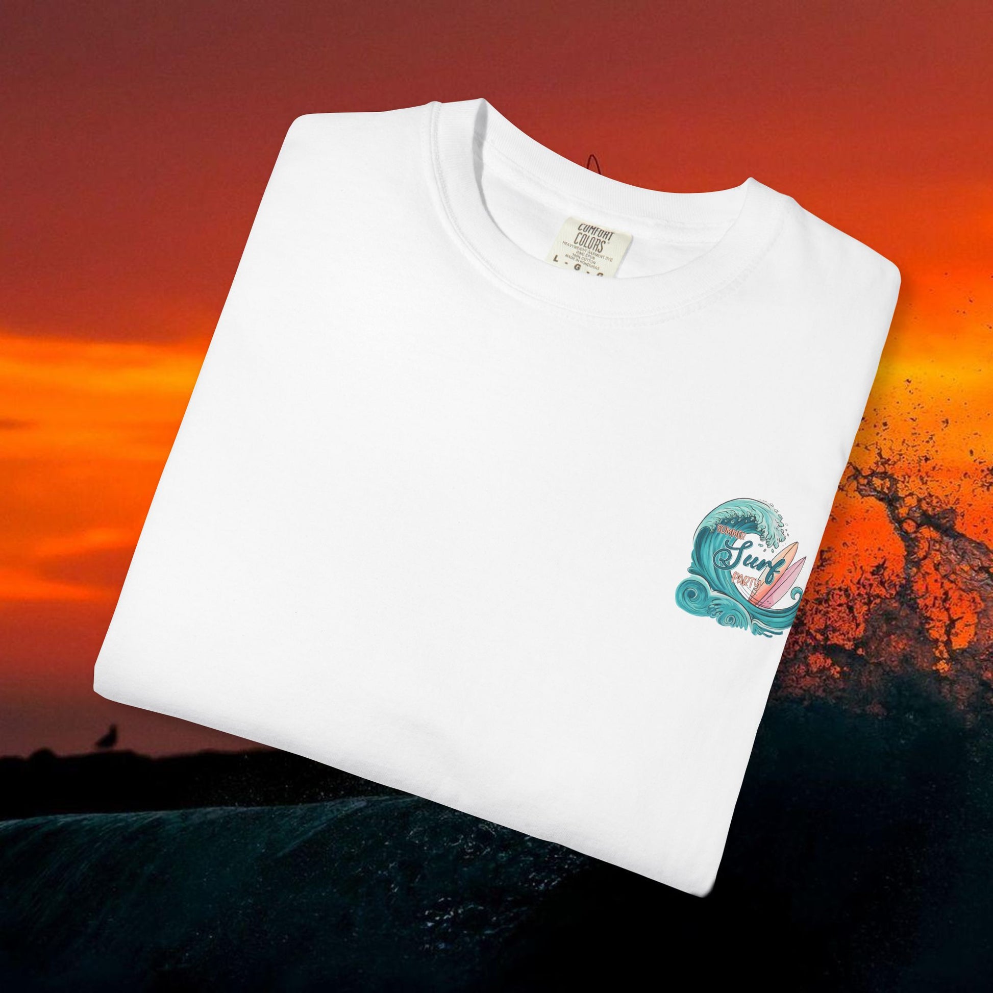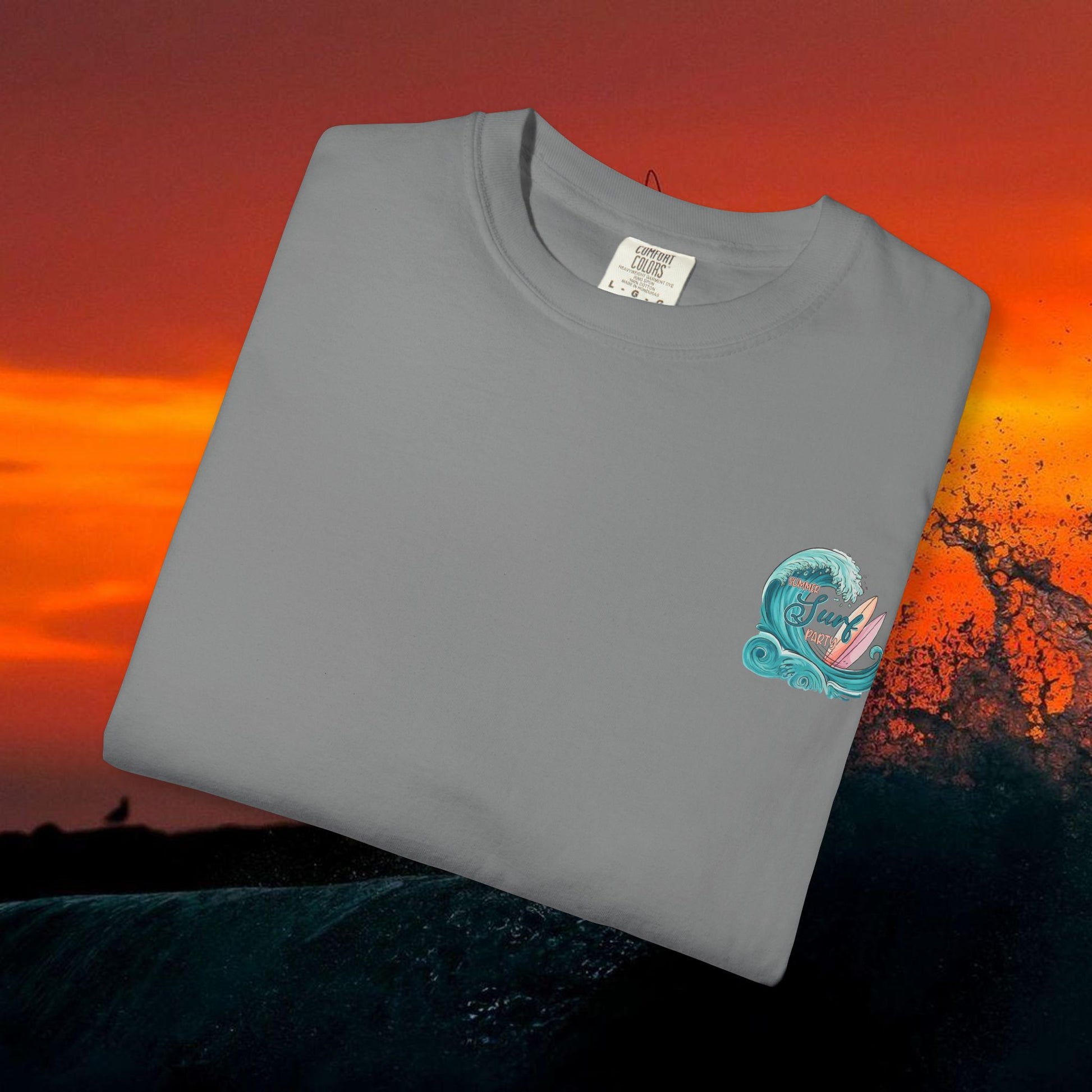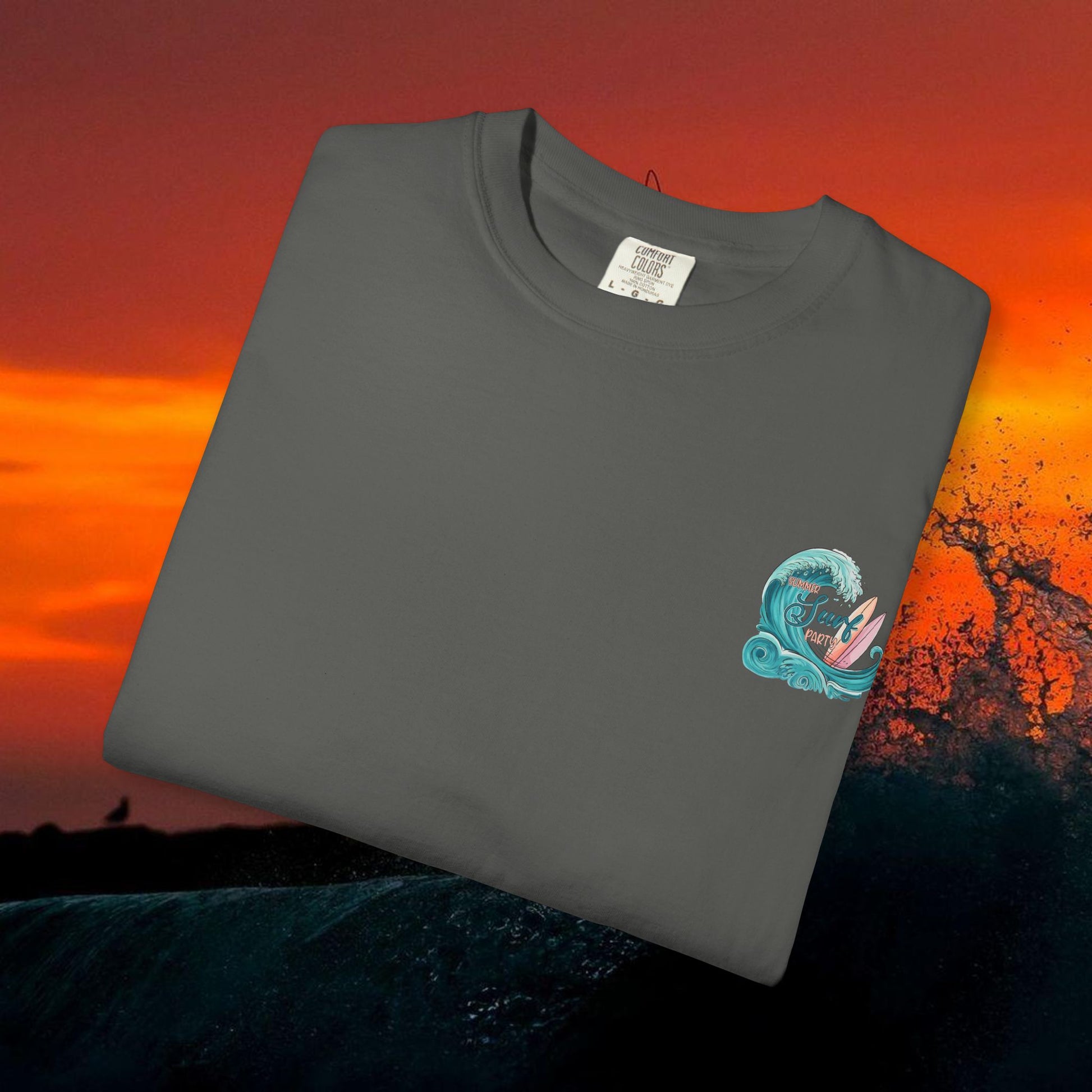 Lightweight but sturdy, this garment-dyed tee carries a sun-worn surf vibe straight off the shore. Soft, lived-in cotton and a relaxed fit let you roll out of the morning surf and into town without changing the mood. A small, hand-drawn crest on the chest balances a bold, hand-painted wave and surfboard scene across the back — colors that feel salt-faded and authentic. Wear it to the beach BBQ, the post-surf coffee run, or whenever you want an easy, comfortable layer that speaks surf culture without shouting.