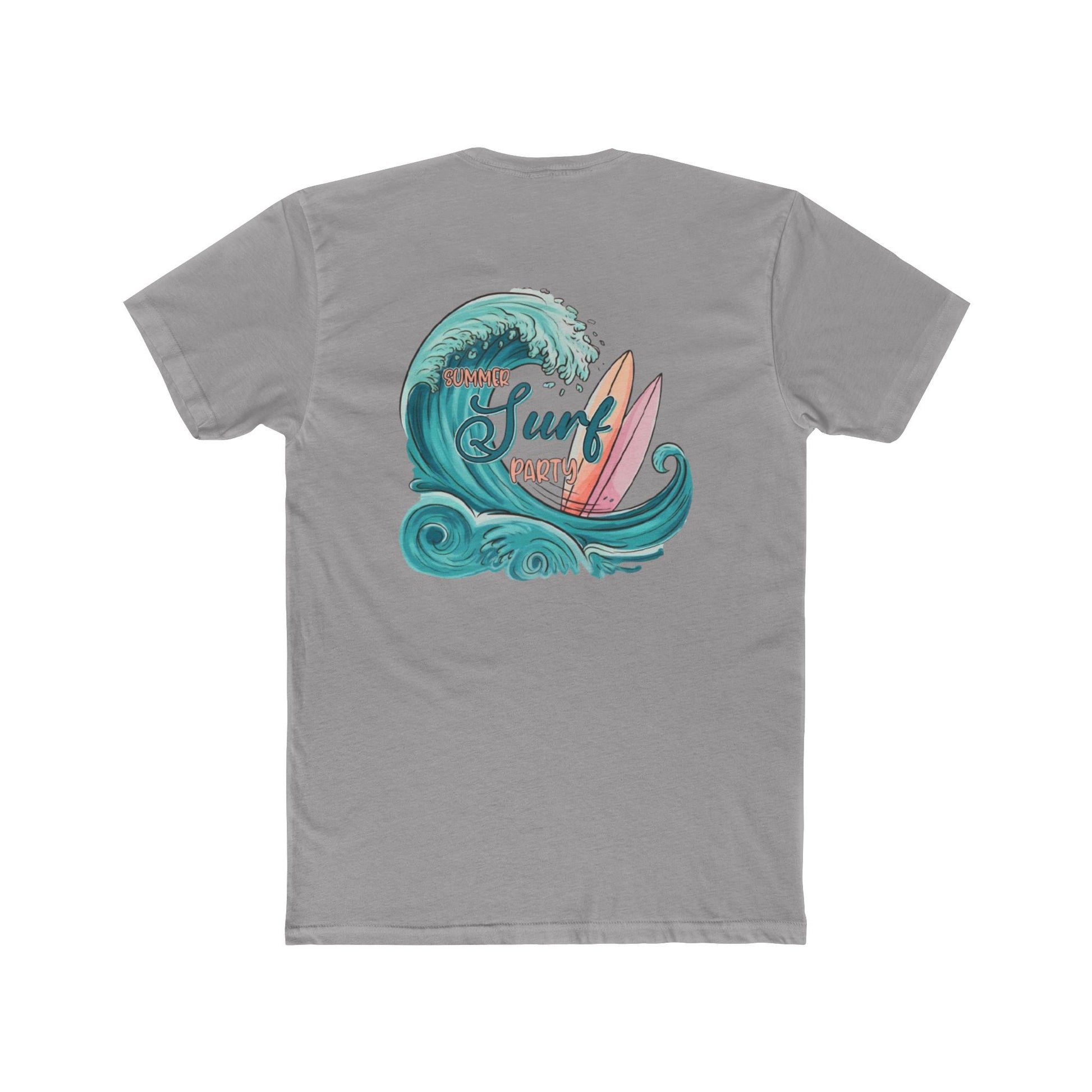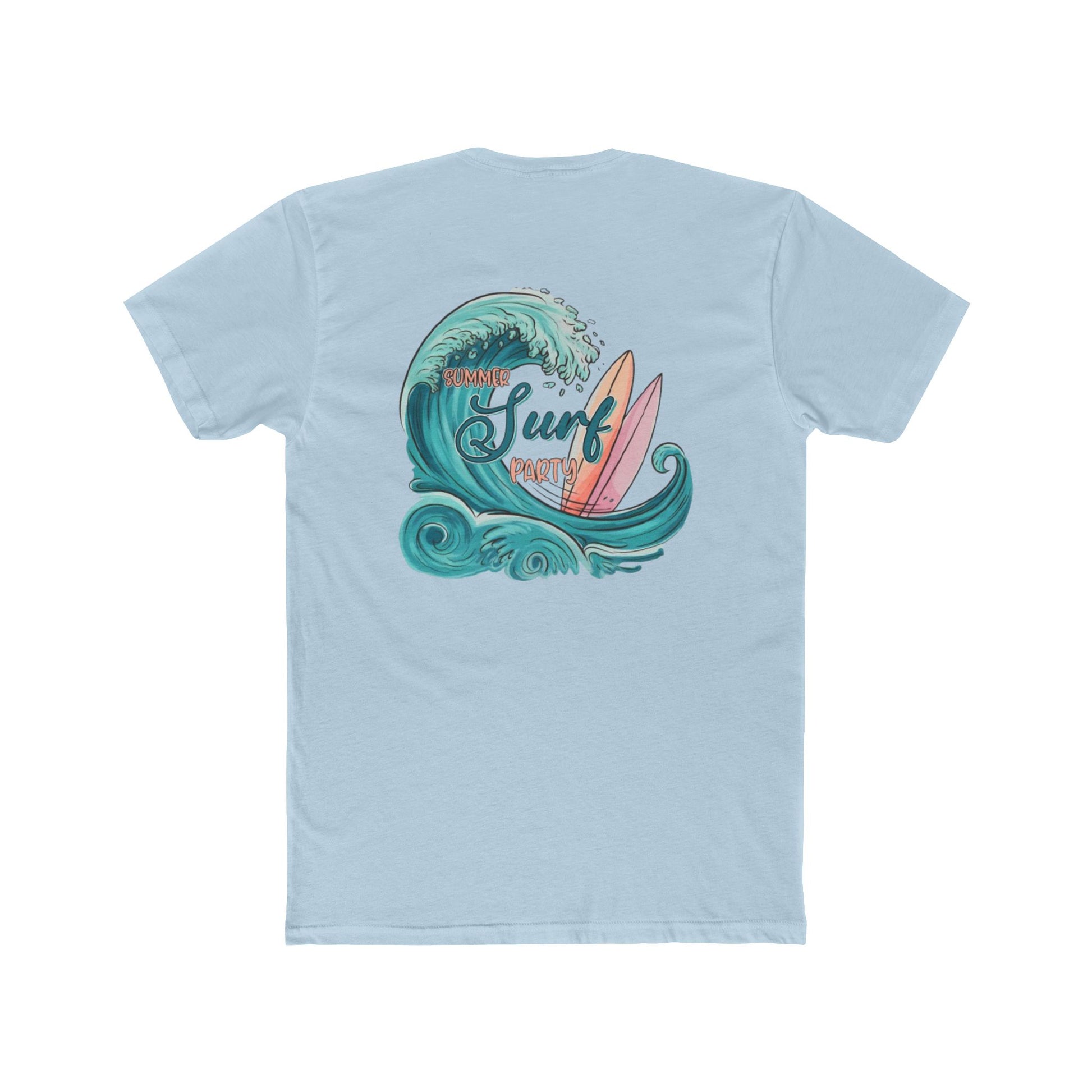 A lightweight cotton crew tee that brings sun, surf, and slow summer days into your everyday rotation. The front features a small crest-style wave and surfboard motif over the heart, while the back blooms into a vintage-inspired wave and twin surfboards with soft teal and coral tones. Wear it after a dawn paddle, on a coastal walk, or layered under an open shirt for drinks at the pier. The classic crew neckline and clean silhouette let the artwork stand out without shouting — casual, calm, and quietly beach-ready.