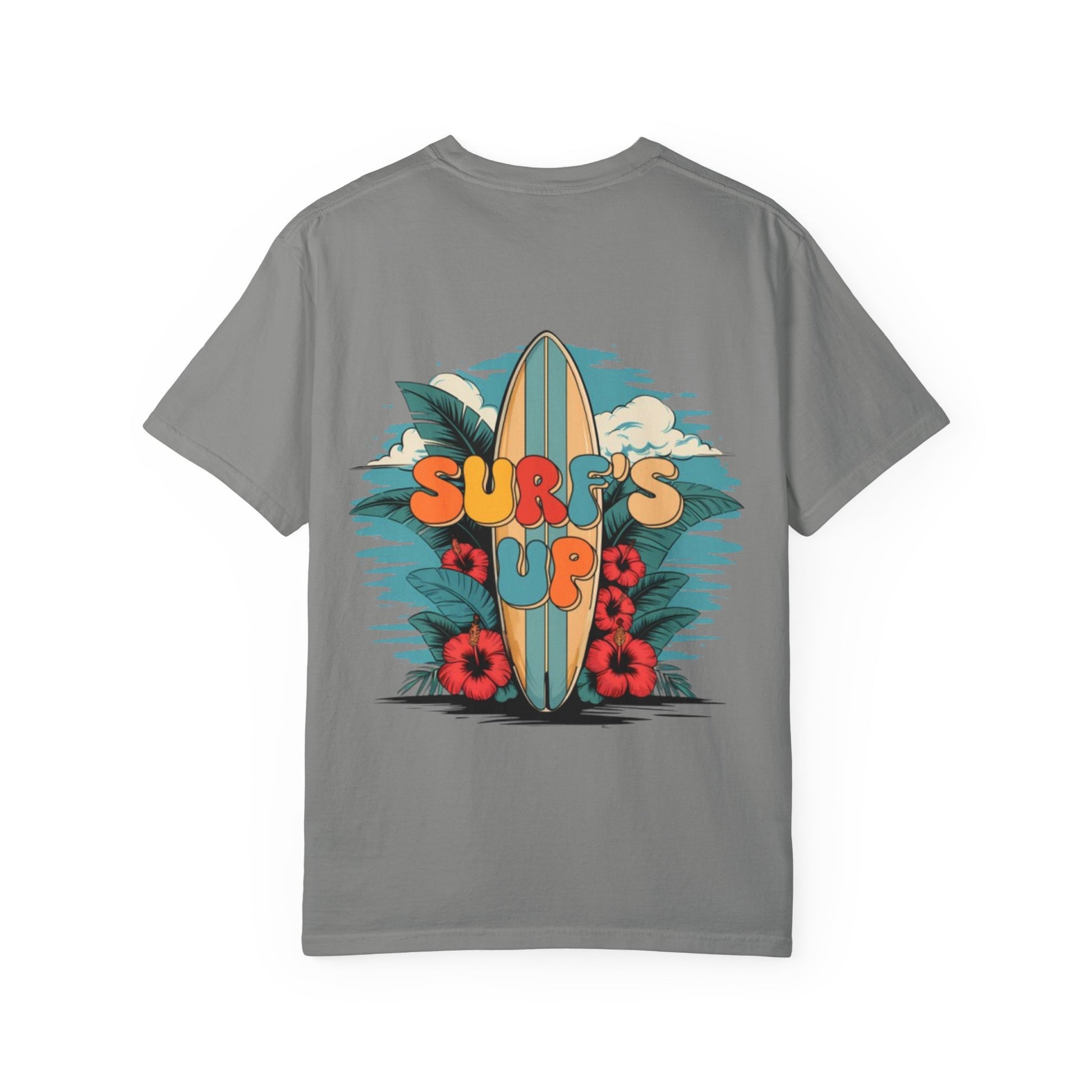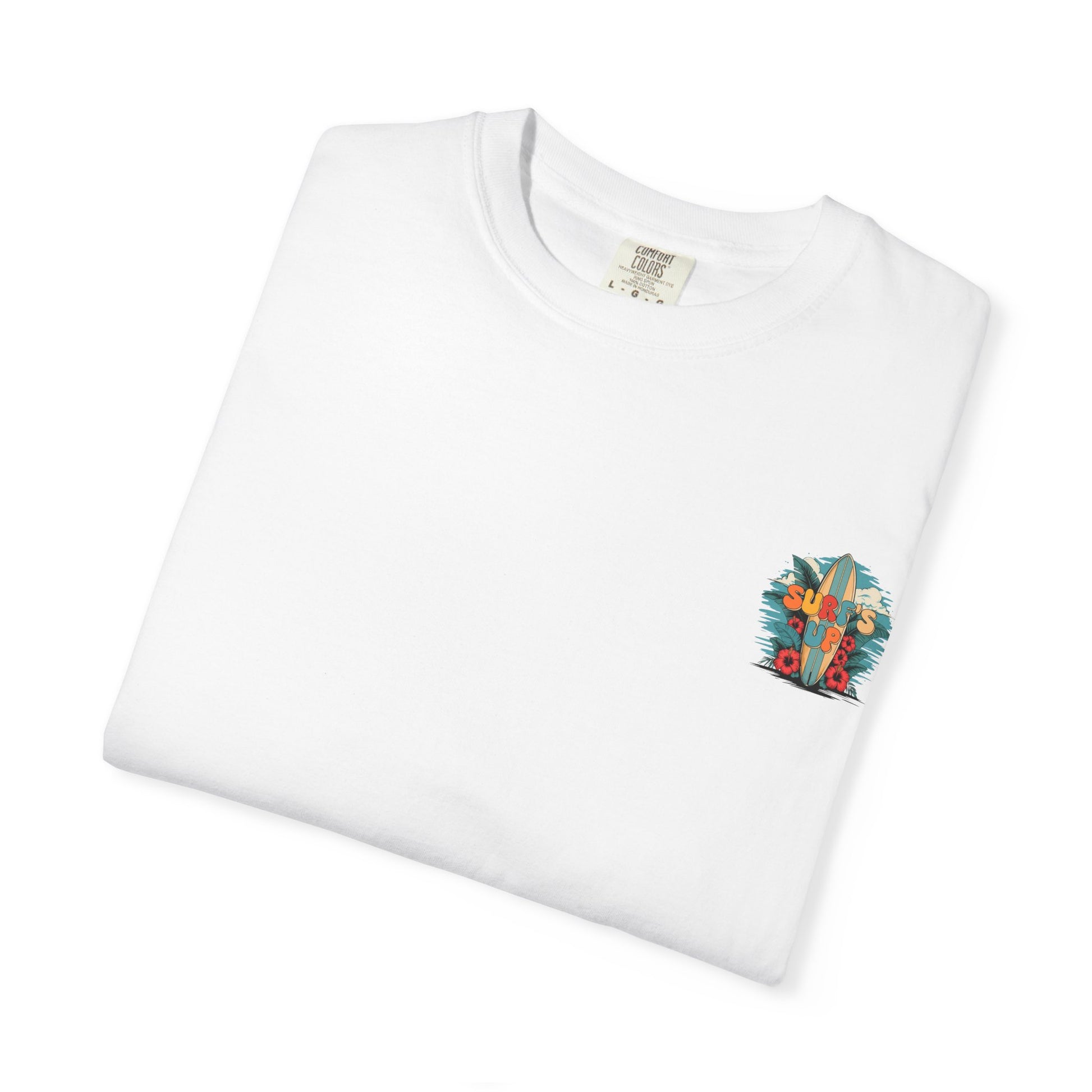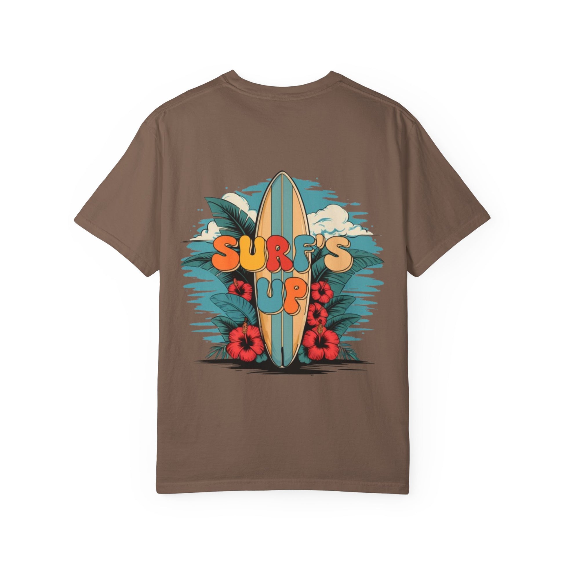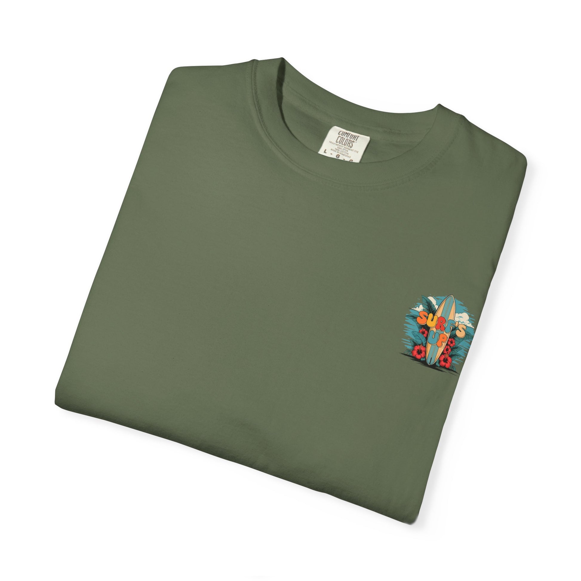 This heavyweight garment-dyed tee carries a laid-back surf vibe—soft from wash-to-wear with a relaxed silhouette that sits easy on the shoulders. A small chest motif and a bold back print place a vintage surfboard and tropical blooms front-and-center, evoking sun-warmed mornings and salt air. Wear it after a dawn paddle, to a beach bonfire, or when you want a comfortable layer that still reads unmistakably coastal. The durable double-needle stitching and tubular, side-seam-free build mean this shirt ages beautifully and maintains its shape through endless washes. Comes in many colors and sizes, so you can choose a faded, lived-in tone that matches your rhythm.