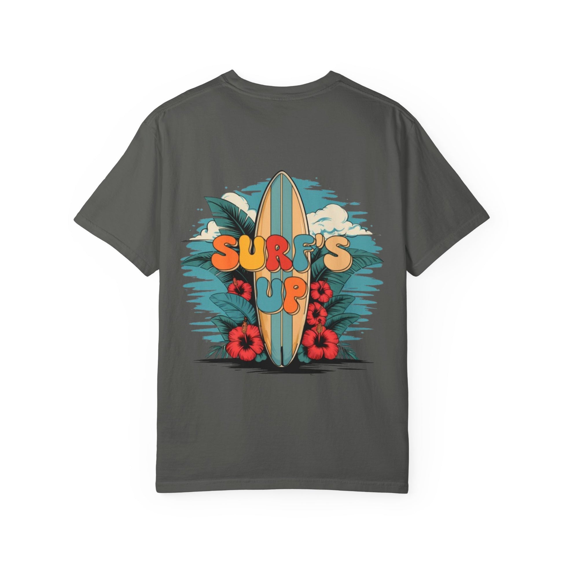 Surf's Up T-Shirt — Retro Surfboard & Hibiscus Beach Graphic