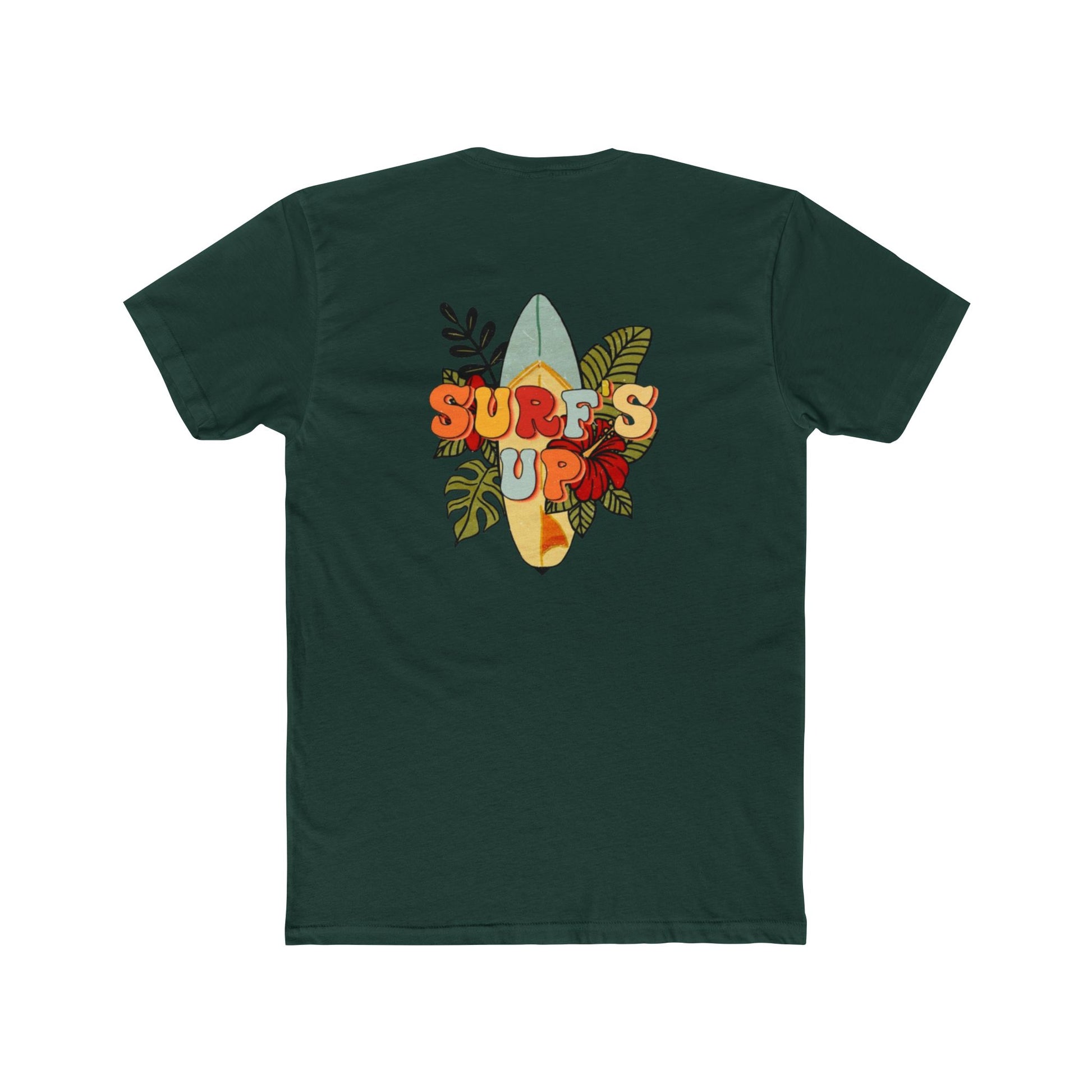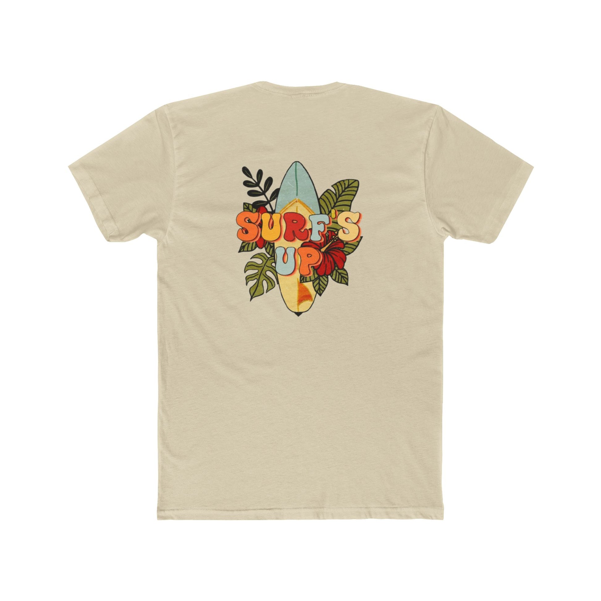 This lightweight cotton crew tee brings easygoing, sunlit surf vibes to your everyday rotation. Soft fabric and a classic fit make it comfortable from morning coffee to late-afternoon beach walks. A small, colorful chest motif and a larger back illustration — a surfboard framed by tropical leaves and vintage-style “Surfs Up” lettering — give the shirt a laid-back, retro feel that reads youthful and adventurous without shouting. Built with reinforced shoulder tape and side seams, it keeps its shape wash after wash, while DTF sleeve details add a subtle, high-quality finish. Wear it layered under an overshirt or on its own when you want something that feels lived-in and ready for the next wave.